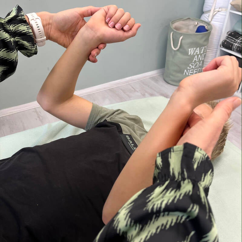 Er is teveel of te weinig spierspanning in de armen. Hierdoor is er moeite met schrijven (ook lelijk handschrift), het gooien en vangen van een bal. Ze vinden het soms fijn om hun handen in vuisten te houden.